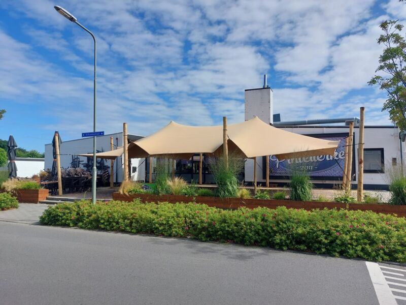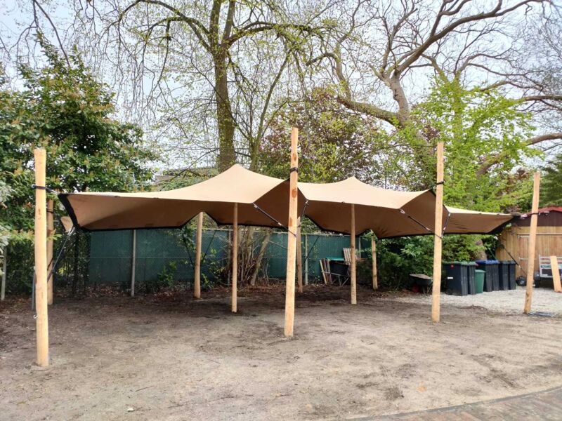 De 10 x 4 meter wordt standaard geleverd met acht vaste palen, twee middenpalen van douglashout en voldoende afspanning.